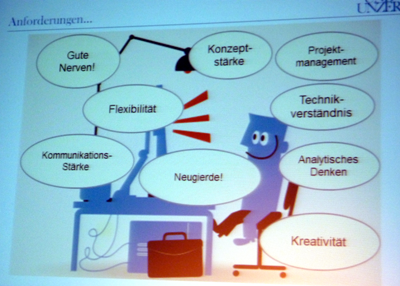 Ihr Aufgabenbereich beinhaltet unter anderem Konzepterstellung für Apps, Kalkulation, Kontakte mit Agenturen, Abstimmungen mit Design und Videoproduktionen, Autorenhonorierung, Workshops zur digitalen Strategie und vieles weitere, was sie anhand einer Woche ihres Terminkalenders demonstriert. Wobei sie sagt, dass es einen typischen Tag in ihrem Arbeitsleben nicht gibt, da alles ständig neu und anders ist. Gefragt sind gute Nerven und Flexibilität, und das wichtigste ist: Neugierig bleiben!