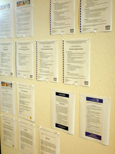 Die ausstellenden Teilnehmer hatten zahlreiche Stellenangebote dabei. Angebote für Praktikums- und Volontariatsplätze, sowie freie Jobs in den Bereichen Marketing, Presse, Lektorat, Vertrieb und vieles mehr waren an mehreren Stellen zu finden.