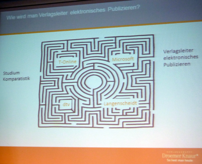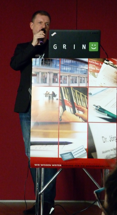 Peter Schmid-Meil (leitet AKEP-Kommission e-book), Programmleiter beim Grin-Verlag, erläutert, was die Verlagswelt bewegt und bewegen muss. Er fordert auf, dass aus Verlegern Medienmanager werden müssen und aus Lektoren Produktmanager. Nicht mehr nur zwischen 2 Buchdeckeln zu denken, sondern in der ganzen Content-Vielfalt. Er wünscht sich für die Branche Nachwuchs, der keine Angst vorm e-book hat.